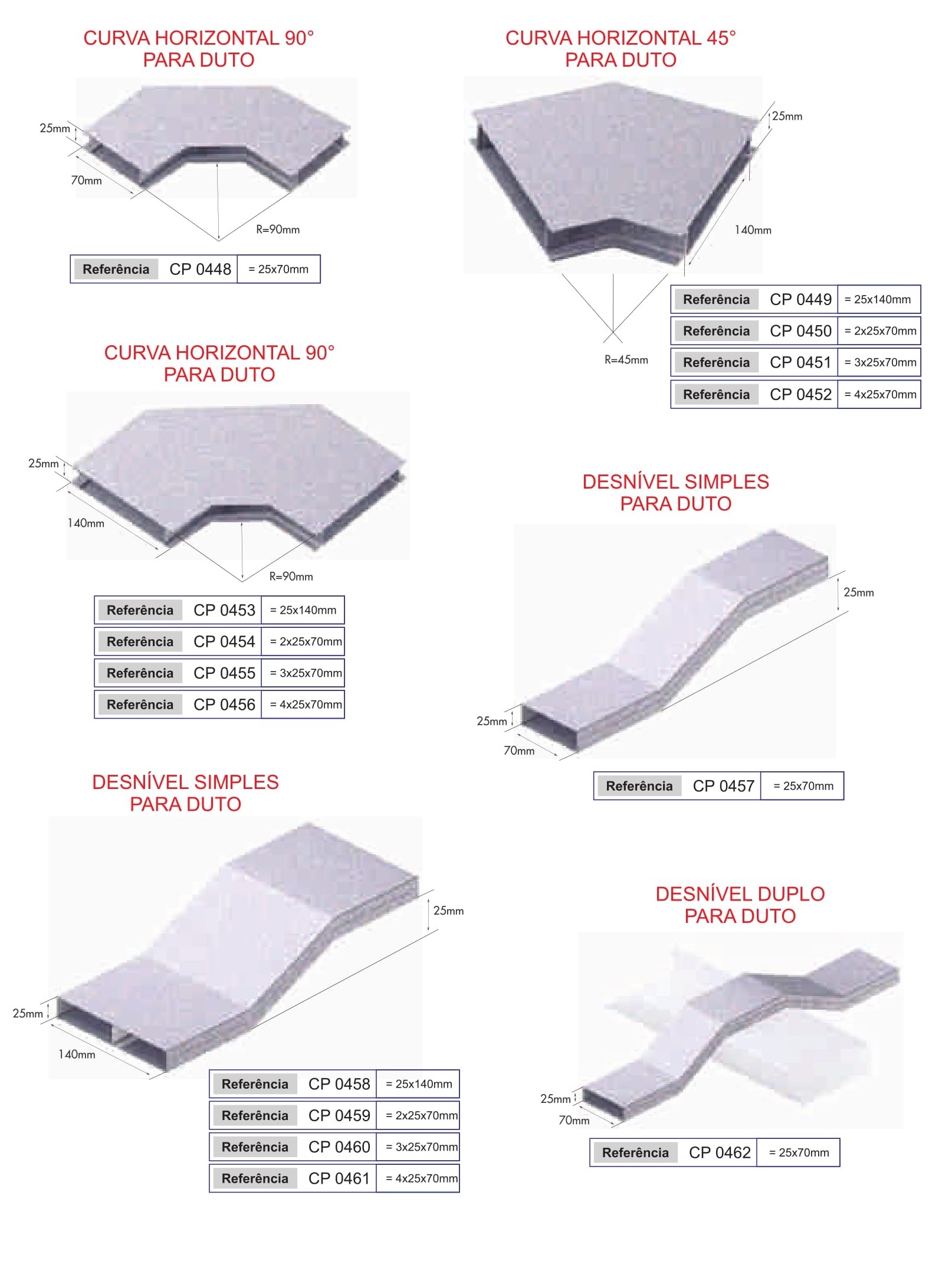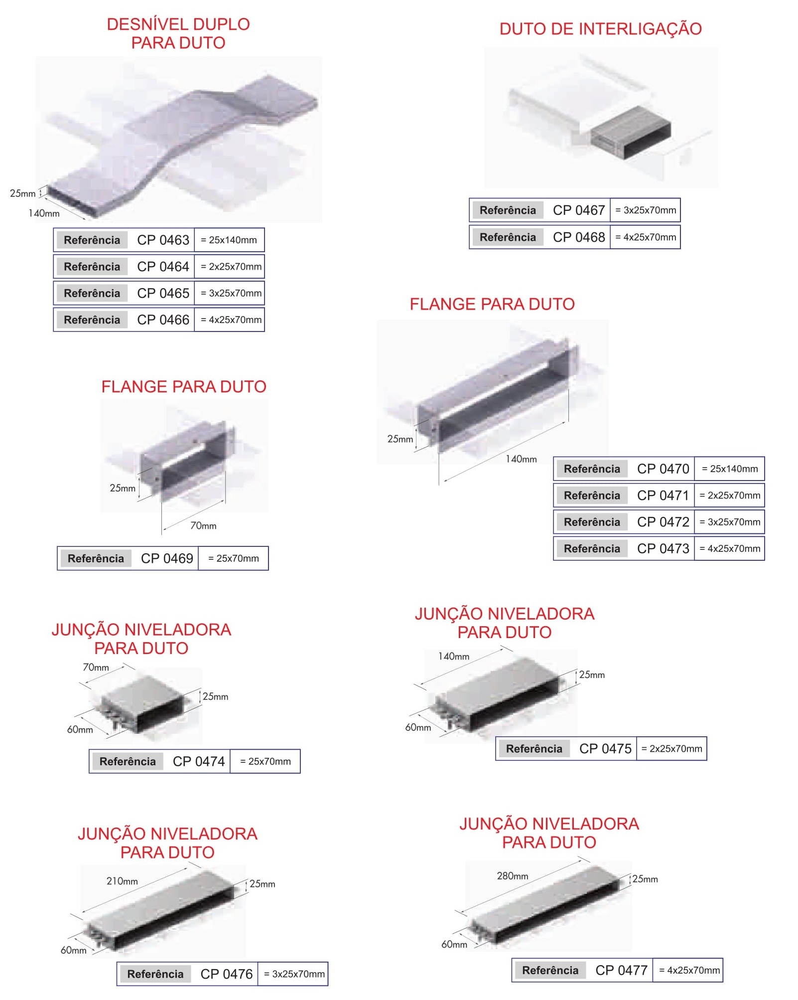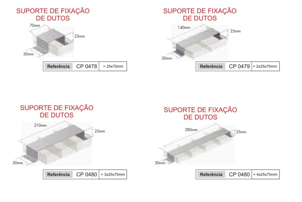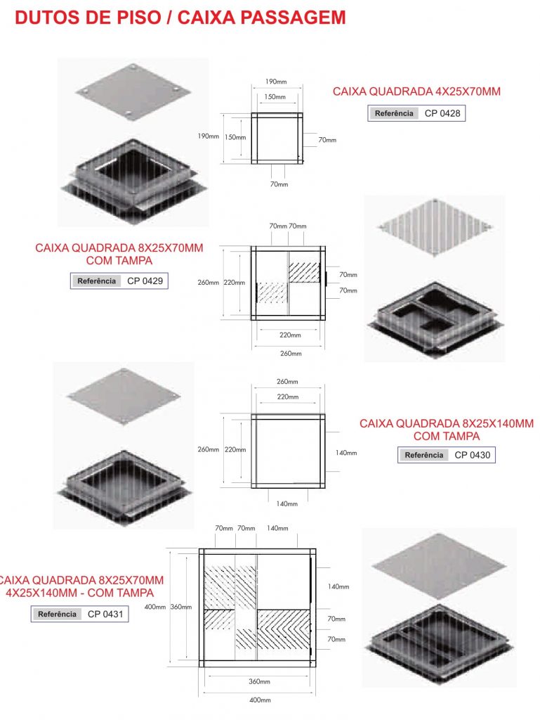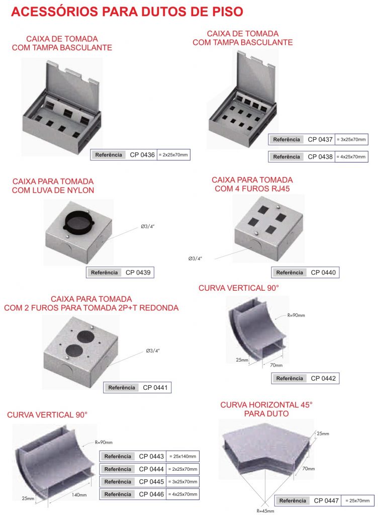 Os dutos de piso é um sistema constituído por dutos retangulares medindo 25×70 mm montados paralelamente na dimensão desejada, dependendo da necessidade e números de circuitos a serem separados entre si, permitindo eficiente distribuição de alimentação dos pontos telefônicos, energia elétrica e lógica.